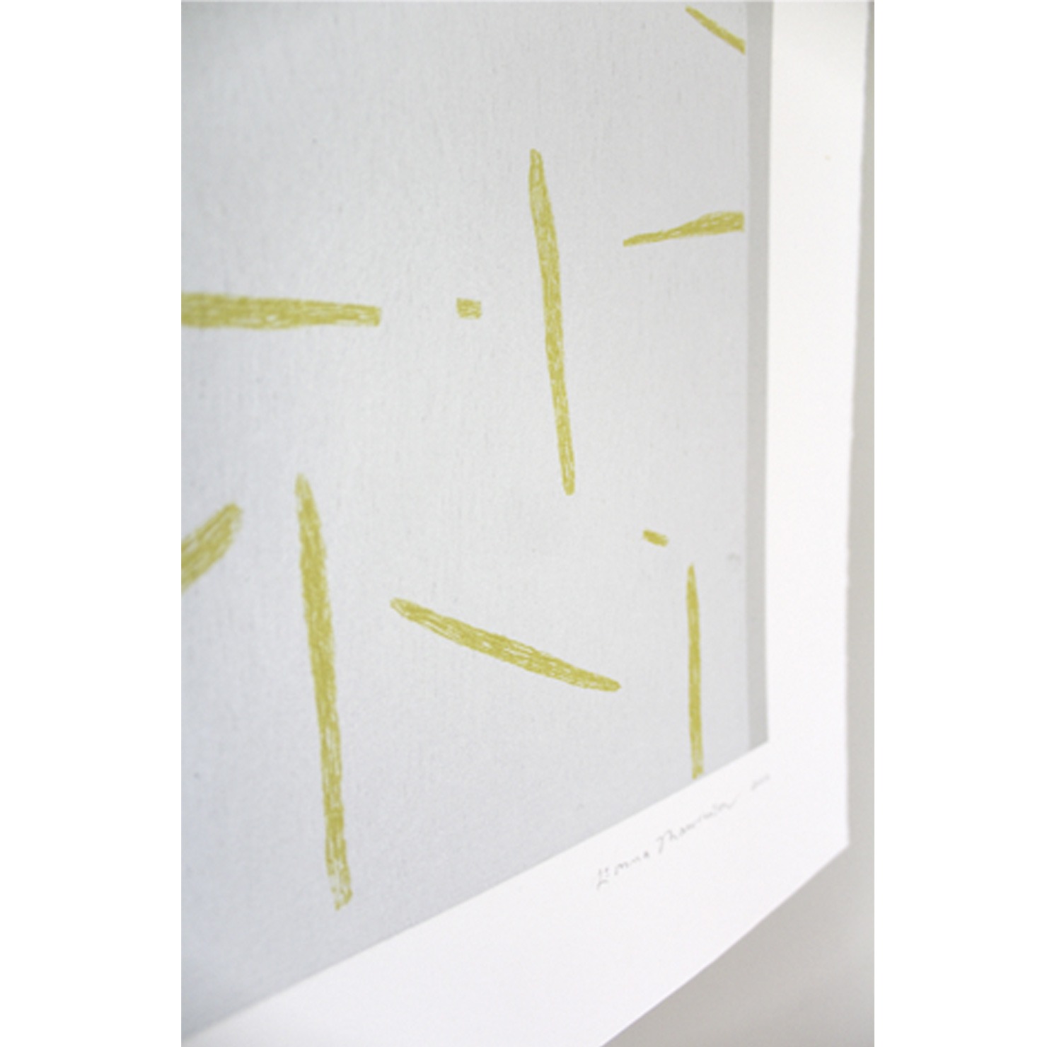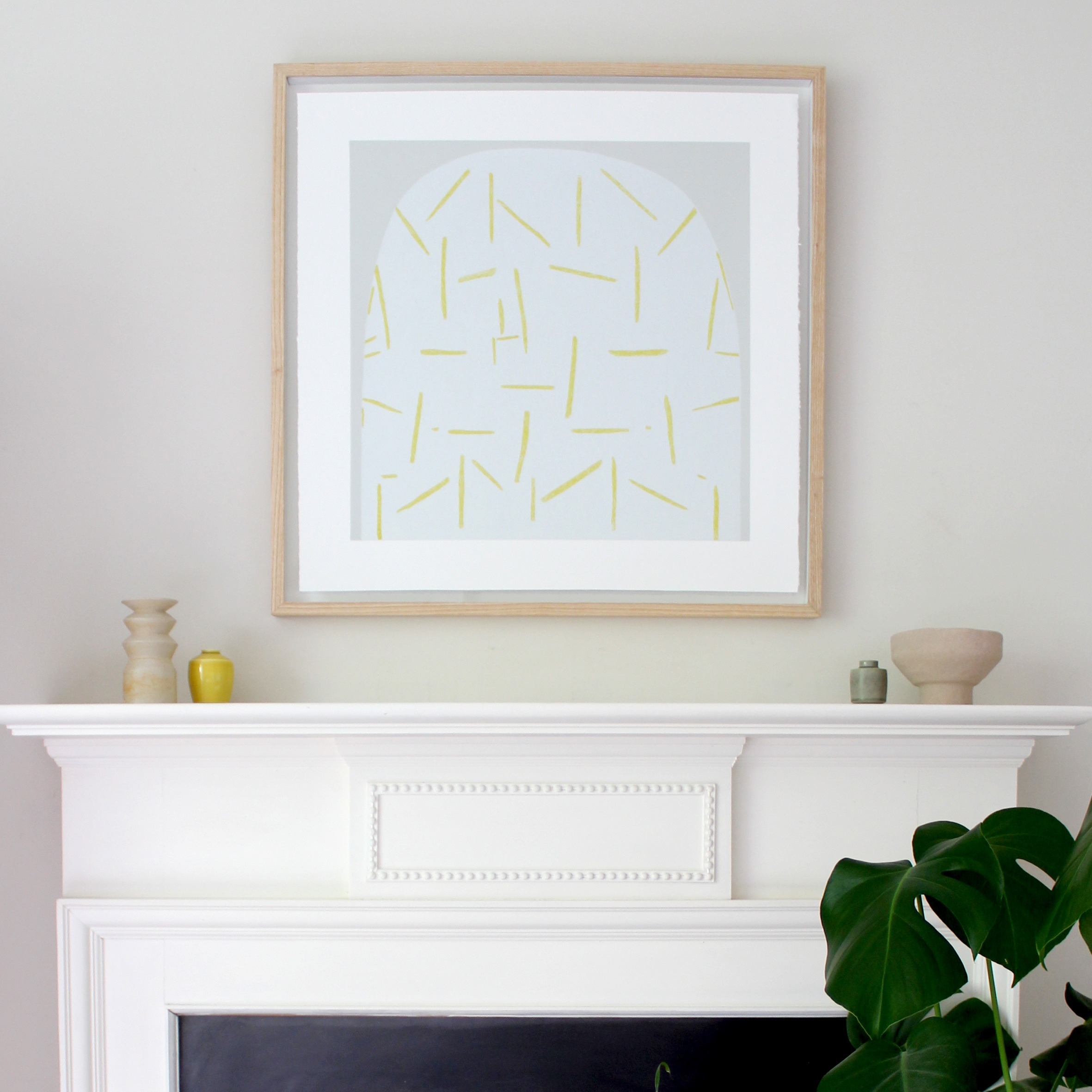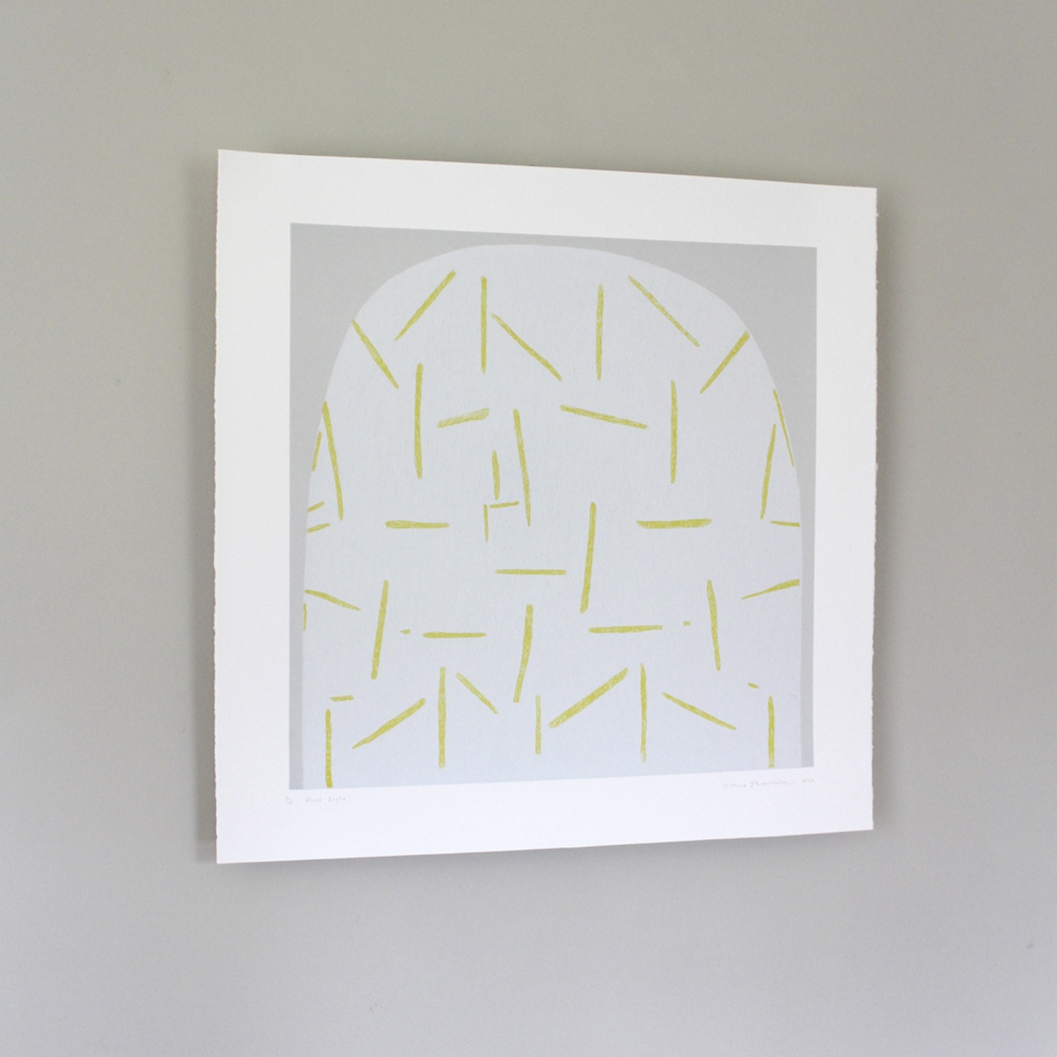 A gorgeous minimal modern abstract in muted shades of grey, yellow and off white – original handmade screenprint called ‘First Light’.
