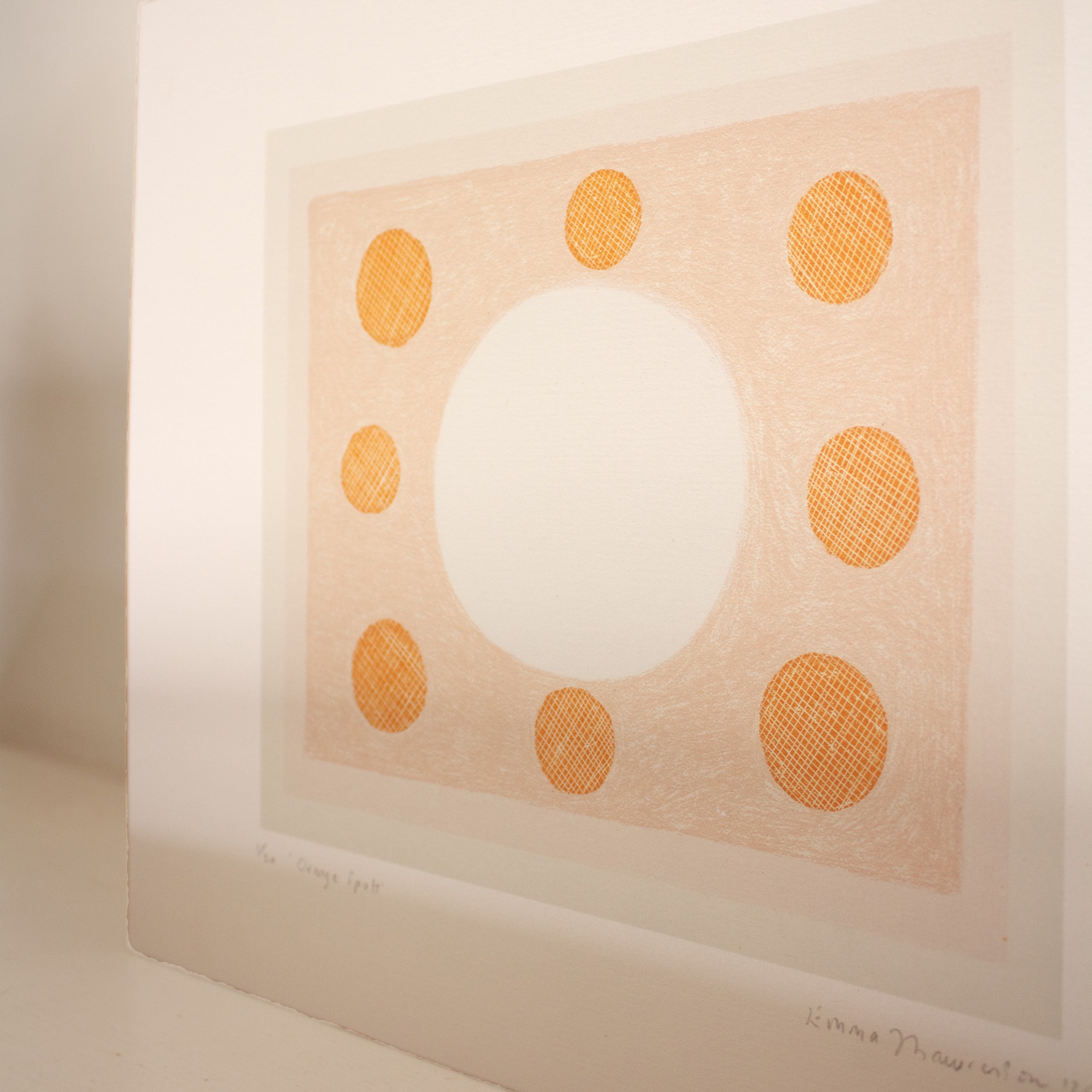 ~ A traditionally made and handcrafted original silkscreen print in pretty orange and pink on Fabriano Rosapina
