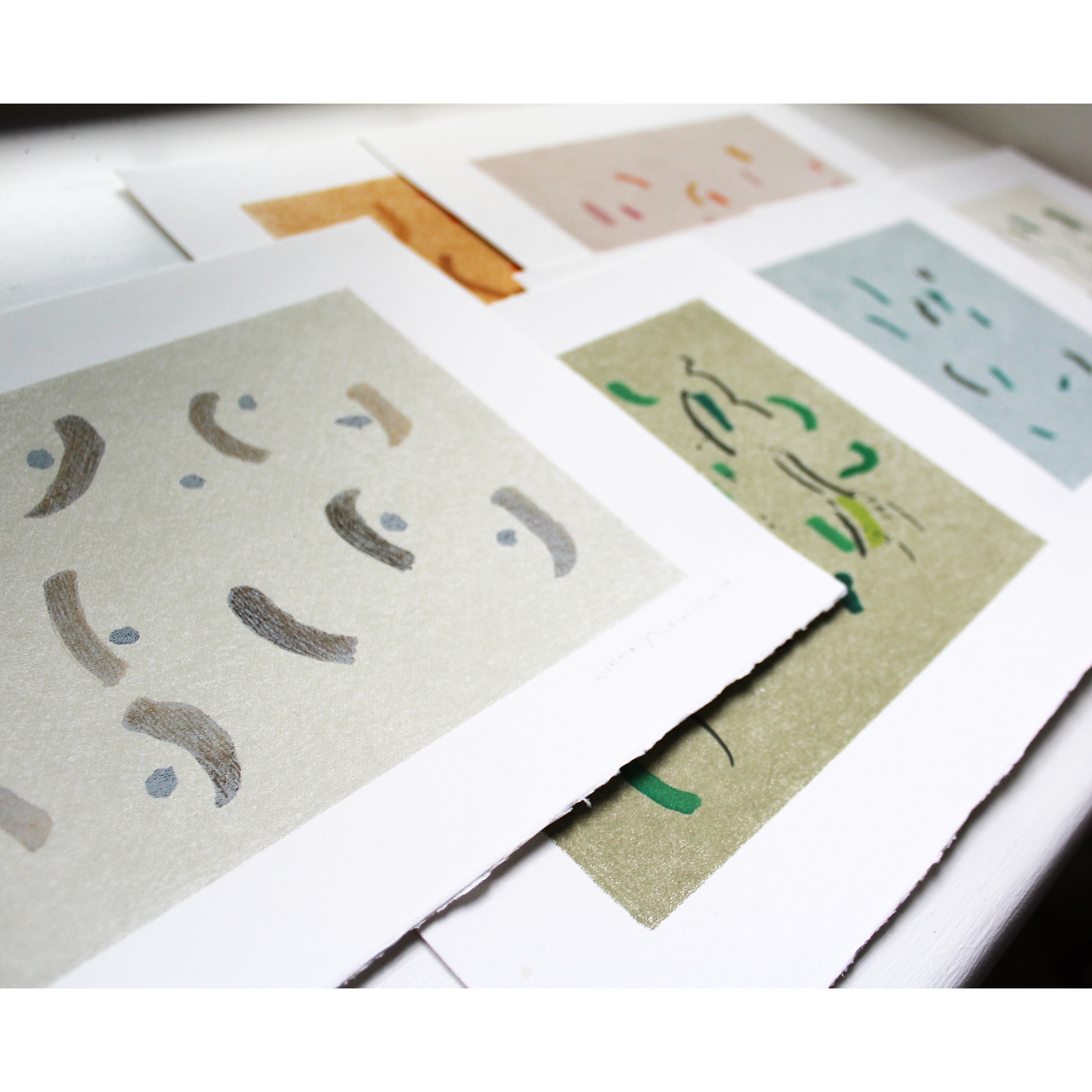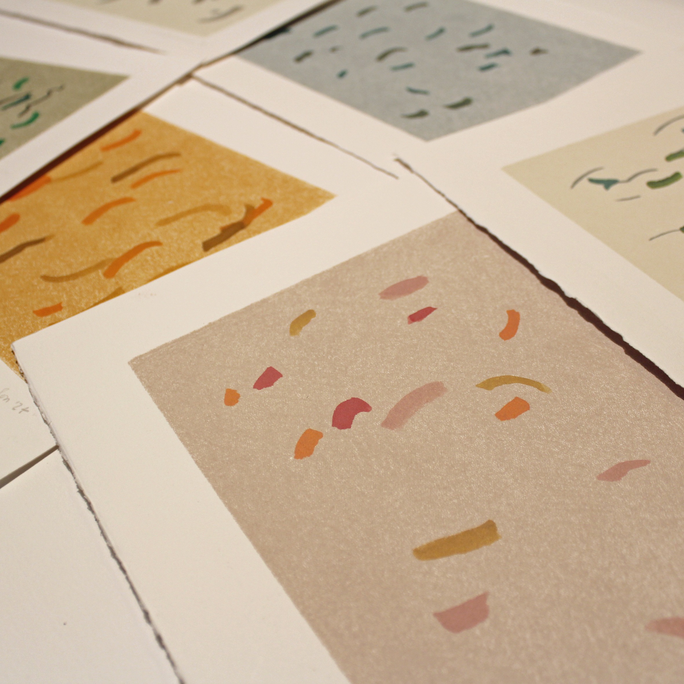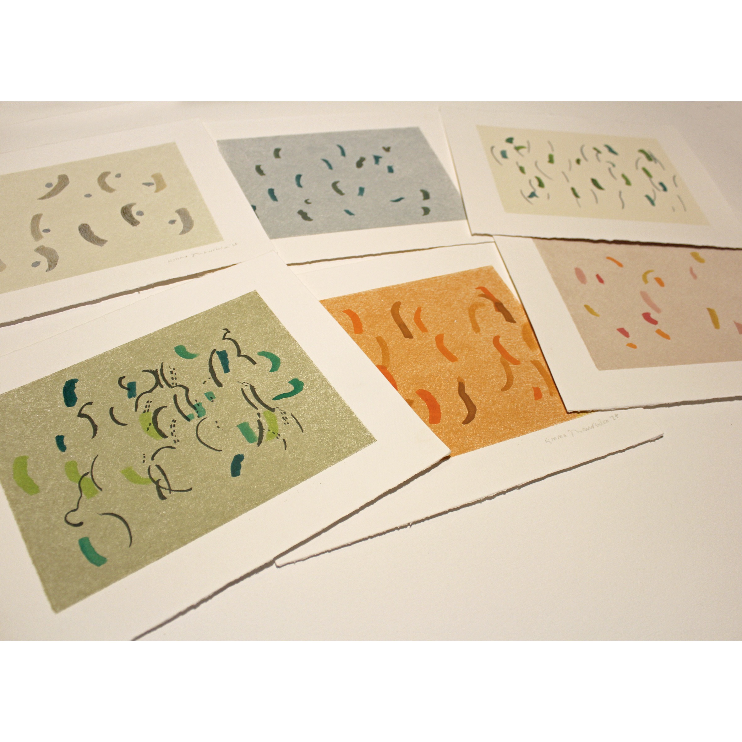 A set of six handmade paintings with a single layer of monoprint ink, in pretty colours. They would make a lovely feature wall, with a peaceful and calm energy.