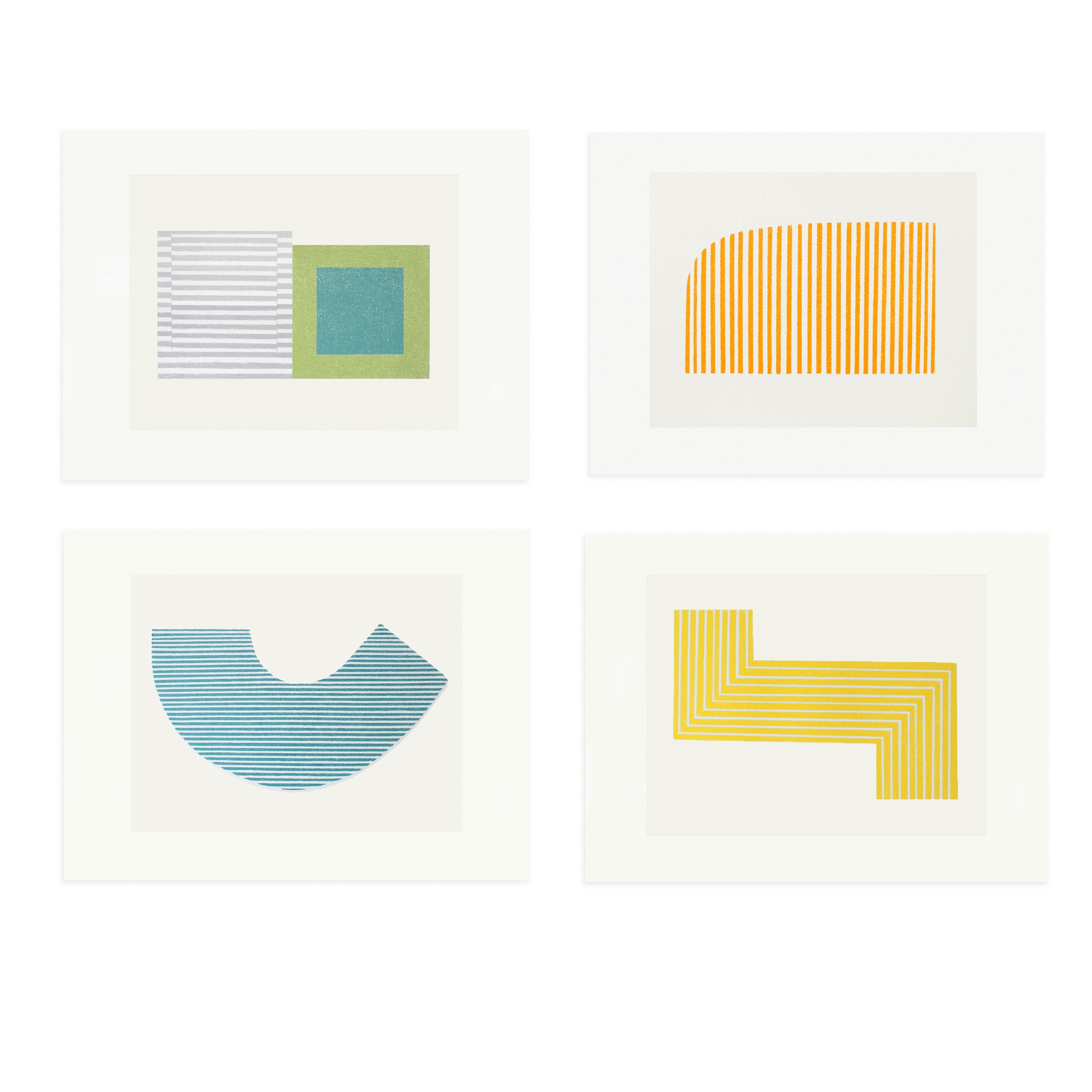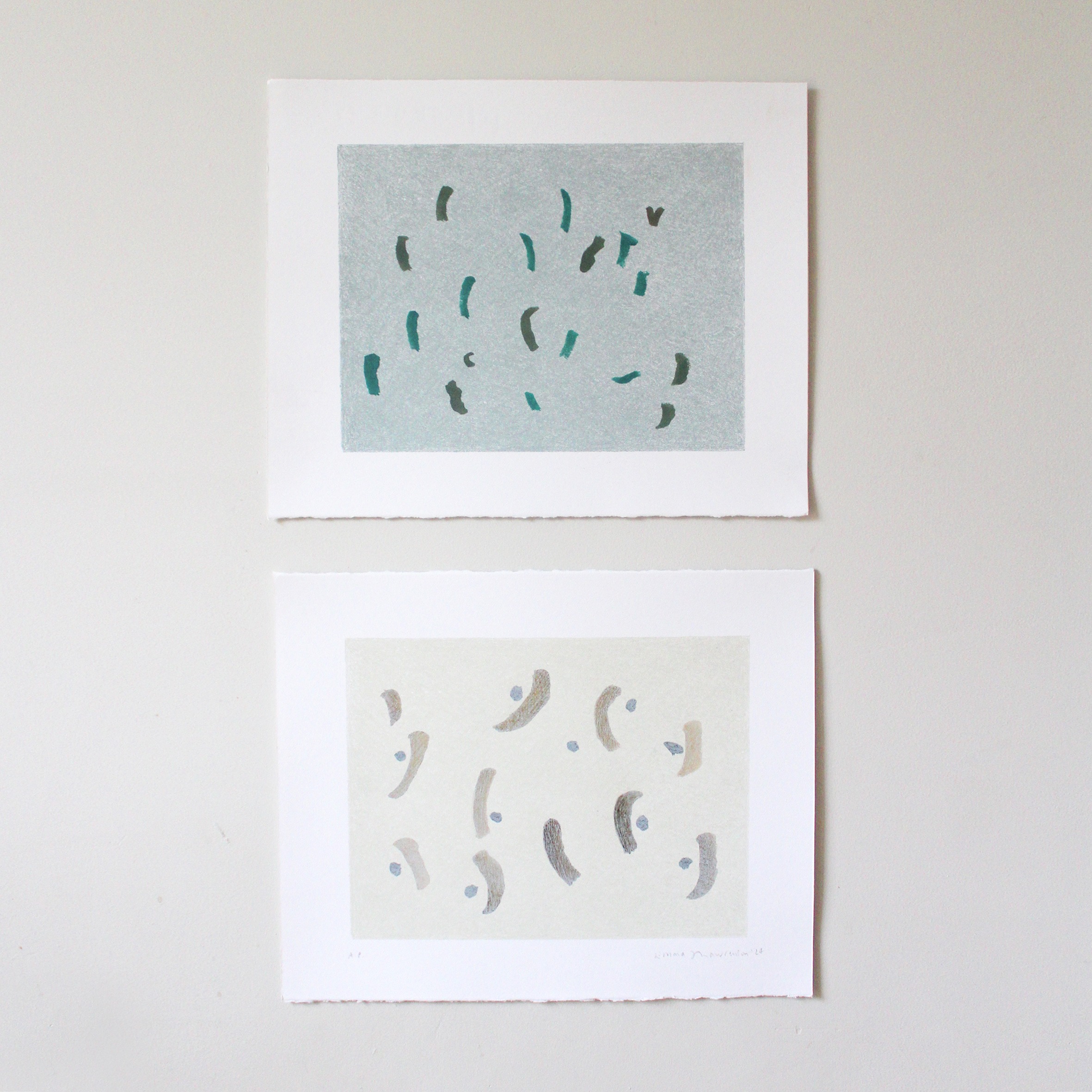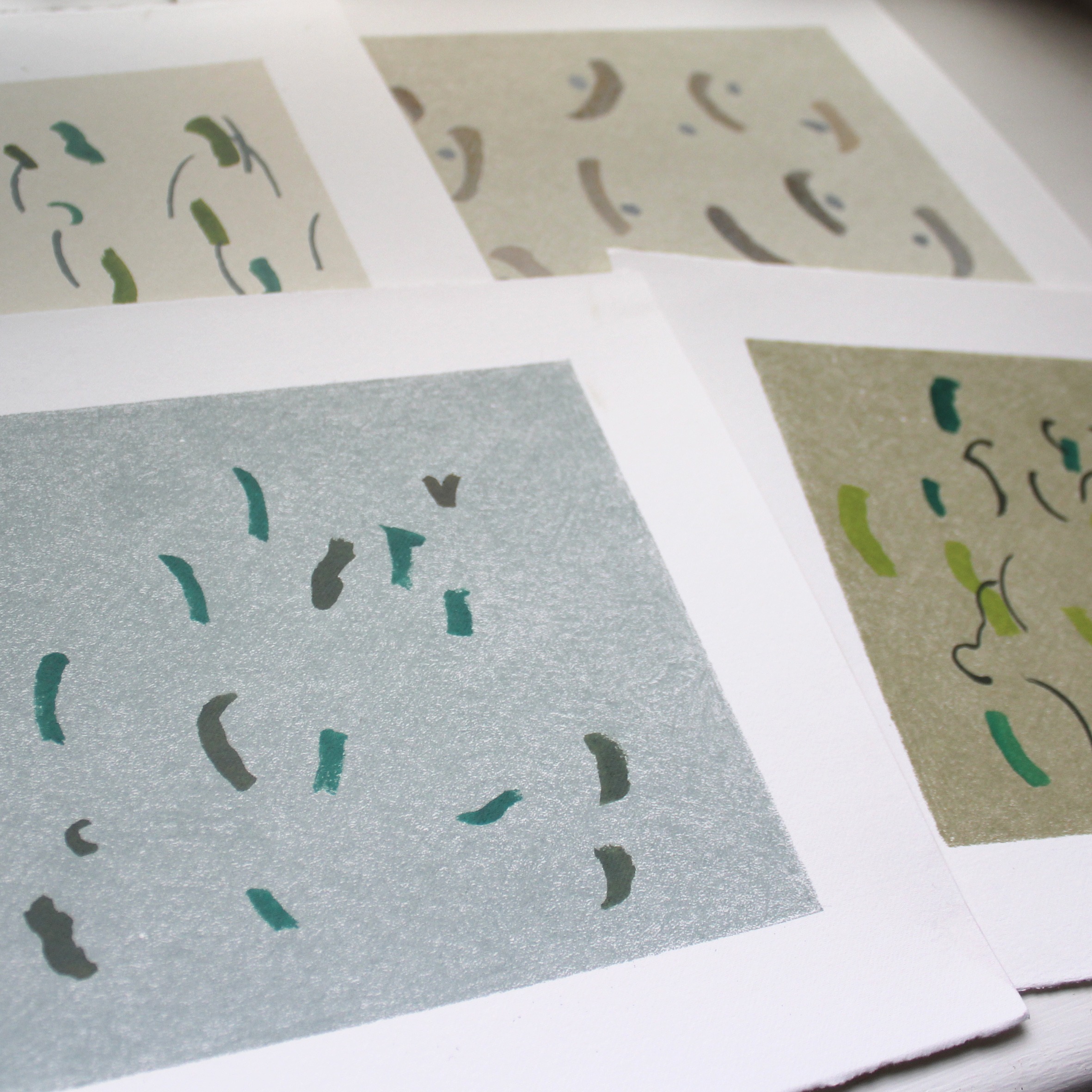 A set of six handmade paintings with a single layer of monoprint ink, in pretty colours. They would make a lovely feature wall, with a peaceful and calm energy.